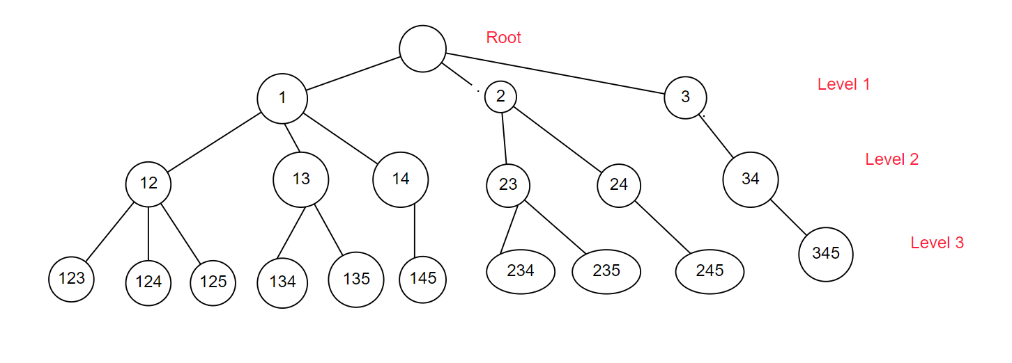 예를 들어 arr = [1,2,3,4,5]에서 $n(S)=3$ 인 집합 S를 뽑는 상황을 생각해보면 아래와 같이 상단 노드에서 시작해 트리를 구성해가면서 Level 3에 해당하는 노드들을 모두 얻어야 한다. 이는 재귀적으로 구할 수 있다.