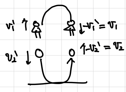 위 그림과 같이 충돌 이후, 사람은 위로 올라갔다 다시 내려오고, 공은 밑으로 내려갔다가 다시 위로 올라와서 다시 충돌을 하게된다. 이때 3의 상황과 같아지기 위해선 -v1' = v1 이고 -v2' = v2 의 조건이 성립해야 한다. 이를 이용해 다음과 같은 v1과 v2의 관계식을 얻을 수 있다.