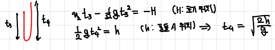 방금은 충돌 이후 다시 상황 3으로 가기 위한 속도 조건만을 분석한 것이고, 시간 조건을 분석하여 v1과 v2를 충돌하는 지점의 위치 h에 관한 함수로 표현할 수 있다. 사람이 충돌 (상황 3)이후 최고점에 도달하는 시간의 2배가 이후의 충돌까지의 걸리는 시간이고 상황 3 이후 물체가 바닥까지 도달하는 시간의 2배 또한 이후의 충돌까지의 걸리는 시간이므로 사람이 최고점의 도달하는 시간과 물체가 바닥에 도달하는 시간이 동일해야 한다.